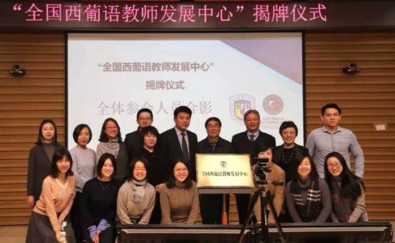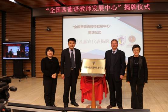为促进全国西葡语教育事业蓬勃发展、加强全国西葡语学科建设,太阳成122cc集团成立全国西葡语教师发展中心,以期为广大西葡语教师提供一个融培训、交流、协同创新与发展为一体的共享平台。中心揭牌仪式于13日上午九点正式开始,北京外国语大学副校长赵刚、人事处副处长兼教师发展中心主任姚金菊、西葡语学院院长常福良以及西葡语学院党总支书记孙眉等为全国西葡语教师发展中心揭牌。